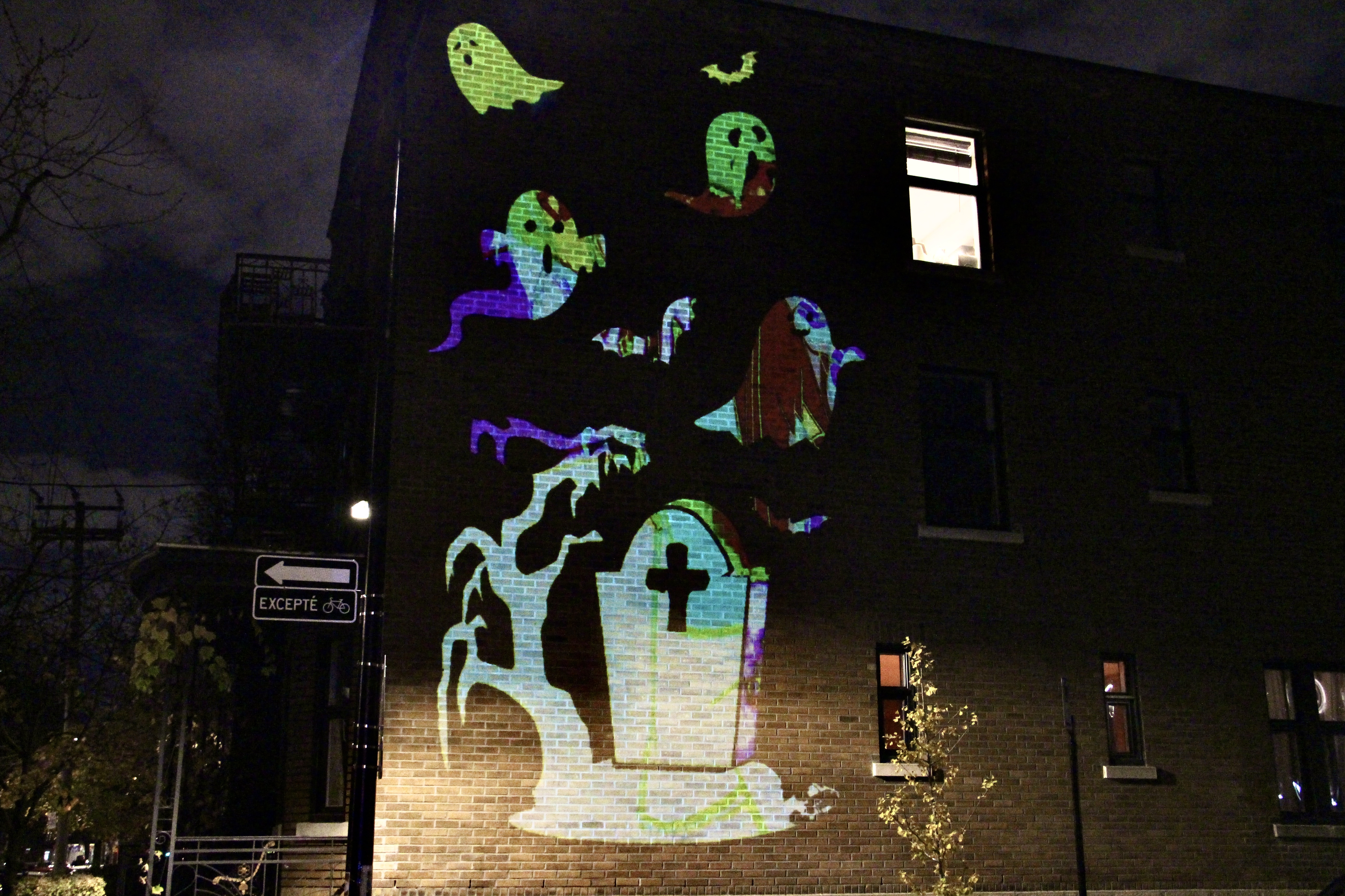 À l’occasion de la fête de quartier pour Halloween, j’ai décié de réaliser un projet de mapping depuis mon balcon afin de venir transformer le mur en face de ce dernier en cimetière avec des fantômes et des chauves souris.